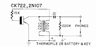 Este simples oscilador com apenas um transistor tem a frequência determinada pelas características do pequeno transformador driver usado. O circuito é de uma Radio Electronics de março de 1950.