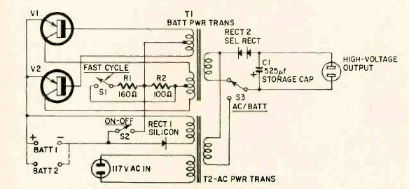 Este é o circuito de um flash comercial dos anos 60. Ele foi publicado na revista Radio Electronics de março de 1961. O circuito é alimentado por duas baterias e tem um transformador inversor de tensão.