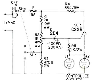 Este circuito foi obtido na revista Radio Electronics de junho de 1964. O SCR pode ser um tipo sensível moderno de uso geral e o diodo é do tipo retificador. A potência máxima depende do SCR usado.