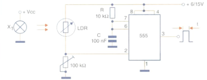 A ação monoestável pode ser um fator importante em muitos projetos. Entende-se por ação monoestável a produção de um pulso de saída de duração constante que independe da velocidade ou extensão do objeto detectado, ou seja, do tempo de interrupção do feixe de luz. Esta ação pode ser obtida facilmente com a ajuda de um circuito integrado 555 na configuração monoestável. O tempo de duração do pulso de saída depende de R e de C no circuito da figura 8. A constante de tempo é dada por: