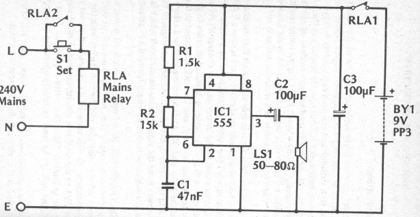 Encontramos este circuito numa documentação inglesa dos anos 80. O circuito é bastante simples, consistindo num oscilador disparado por um relé de corrente alternada.