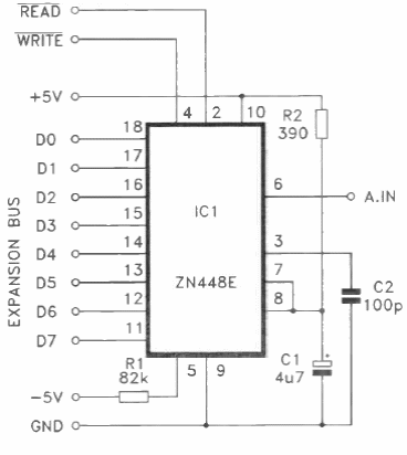 Indicado para aplicações com um PC, este circuito foi obtido numa publicação inglesa de 1992. O circuito integrado ZN448E não é comum atualmente.