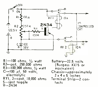 Este timer automático reciclável foi encontrado na revista Radio Electronics de julho de 1960. O circuito aciona um relé alcançando intervalor de alguns minutos conforme o capacitor usado.