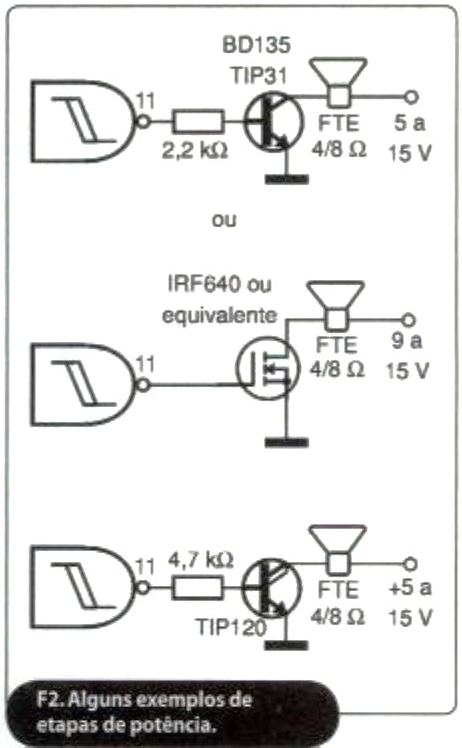 O circuito mostrado na figura 1 gera um tom intermitente em um transdutor piezoelétrico, quando o sensor de toque é ativado. A frequência do tom é dada basicamente por R2 que pode ter valores entre 10 k e 100 k ohms. Será interessante determinar o valor que produz o som de maior volume no transdutor, pois, muitos deles têm seu rendimento máximo numa frequência de ressonância em torno de 4 kHz. A intermitência depende de R3 e C2 que também podem ser alterados numa boa faixa de valores. O transdutor cerâmico fornece uma boa potência de áudio para aplicações alimentadas por pilhas ou bateria de 9V, uma vez que tem baixo consumo. No entanto, para aplicações em que maior potência se faz necessária, ou ainda em que o leitor deseje usar um alto-falante, as etapas de potência da figura 2 podem ser utilizadas. Para alimentação acima de 9 V, o transistor deve ser dotado de um radiador de calor. O sensor de toque consiste em duas chapinhas de metal separadas, que devem ser tocadas simultaneamente.