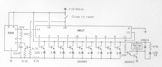 Este circuito foi obtido numa documentação dos anos 90. A solução que pode ser encontrada em outros pontos deste site tem o acionamento sequencial de leds e se baseia tanto na 4017 como no 555. o tempo de cada passo depende do capacitor junto ao 555.