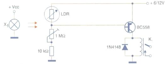 Este circuito é bastante simples e se o LDR for montado em um tubo opaco com lente, sua sensibilidade permite uma separação de até mais de 1 metro entre o sensor e a fonte. A fonte de luz é uma lâmpada de 5 a 12 V com pelo menos 100 mA de corrente, dependendo da distância de separação. Uma lâmpada incandescente de 5 a 40 W também pode ser usada para conexão na rede de energia. A sensibilidade é ajustada no trimpot de 1 M Ω e o relé deve ter uma corrente máxima de bobina (acionamento) de 50 mA, com tensão de acordo com a alimentação usada. O circuito é dado na figura. Lembramos que, com a passagem de um objeto diante do relé, ele fechará por um breve instante seus contatos, enviando assim um pulso de controle ao circuito externo. Trata-se, portanto, de um circuito de ação momentânea, e não monoestável ou biestável. Podemos usar os contatos do relé para acionar um monoestável com o circuito integrado 555, por exemplo, se assim a aplicação o exigir.