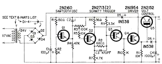 Usando 5 transistores, sendo um deles unijunção, este circuito foi encontrado na revista Radio Electronics de junho de 1964. Os transistores são da época, mas podem ser testados equivalentes modernos, inclusive o transistor unijunção.