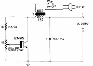 Encontrada em publicação dos anos 60, esta fonte não tem regulagem, mas apenas ajuste de intensidade da corrente, funcionando o transistor também como retificador.