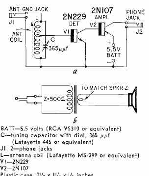 Este circuito para a faixa de AM com dois transistores foi encontrado na revista Radio Electronics de junho de 1960. Deve usar uma boa antena e é alimentado por bateria.