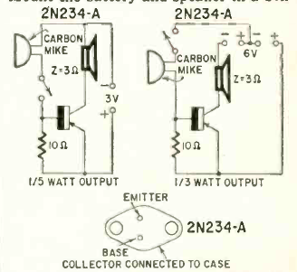 Estes dois circuitos foram encontrados na revista Radio Electronics de fevereiro de 1960. O transistor é tipo de potência da época e o microfone deve ser de carvão.