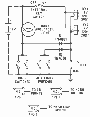 Encontramos este circuito numa Radio Electronics de novembro de 1976. O circuito é para veículos da época com contatos de ignição mecânicos. O circuito usa dois relés de 12 V.