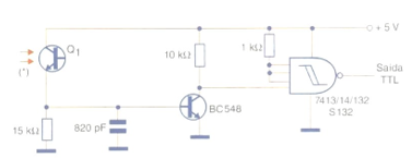 Esta configuração (usando uma porta lógica com saída compatível TTL) utiliza um transistor amplificador para se obter maior sensibilidade. O capacitor atua como um filtro, evitando a ação de espúrios que possam aparecer ao se cortar a luz incidente no sensor. O resistor de 15 k O na base do transistor determina a sensibilidade e eventualmente pode ser alterado na faixa de 4k7 a 47 kohms, conforme a aplicação. O circuito é mostrado na figura e qualquer fototransistor comum pode ser usado como sensor.