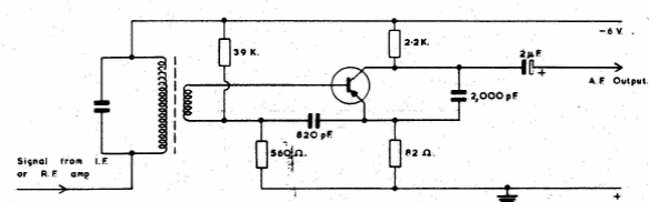 Na figura temos uma etapa detetora típica para um receptor de rádio. O circuito é de 1963, sendo válido para transistores de germânio da época.