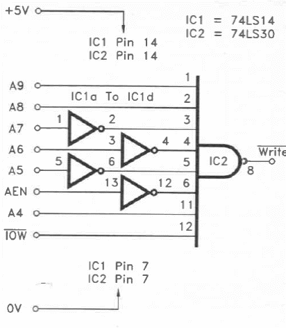 Este circuito decodificador TTL para portas de um PC foi encontrado numa documentação de 1992. A alimentação pode vir do próprio circuito do PC.