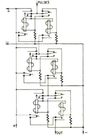 Este circuito utiliza os flip-flops do circuito anterior para implementar um contador binário de 3 dígitos. O circuito é de uma Radio Electronics de outubro de 1961.