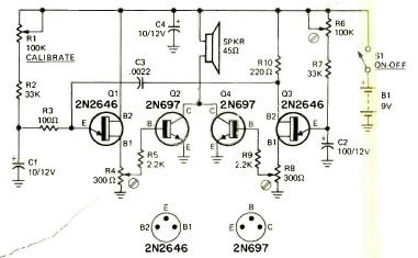 Este timer com 4 transistores foi encontrado na revista Radio Electronics de abril de 1975. Ele faz uso tanto de transistores comuns como unijunção fornecendo uma saída auditiva dupla.