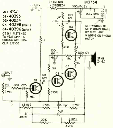 Este pequeno amplificador foi encontrado na revista Radio Electronics de outubro de 1966. Ele utiliza uma série de transistores da RCA para aplicações deste tipo lançados na época.