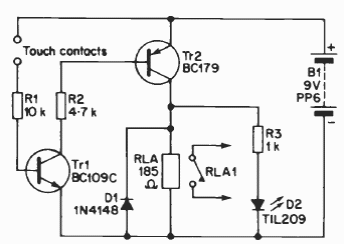 Este circuito usa apenas dois transistores de uso geral disparando um relé sensível. Nunca alimente este circuito com fonte sem transformador. Podem ser usados relés de outras tensões com alteração da fonte.