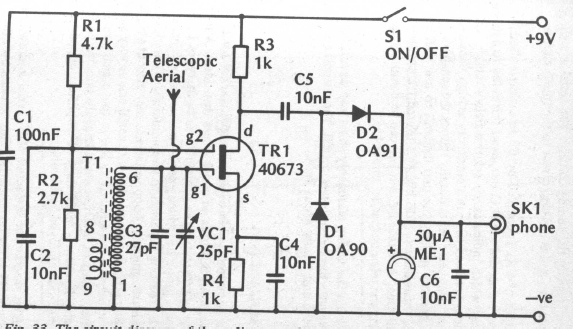 Este circuito foi originalmente criado para monitorar sinais de um transmissor de controle remoto para a faixa dos 27 MHz. O circuito é de uma documentação inglesa de 1989.