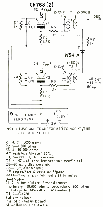 Este circuito gera sinais em frequências fixas para calibração de receptores de ondas curtas. Encontramos numa revista Radio Electronics de setembro de 1959. O circuito é alimentado por duas pilhas.