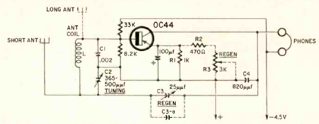 Encontramos este circuito na revista Radio Electronics de janeiro de 1962. O circuito exige boa antena e tem escuta em fones de alta impedância. A alimentação vem de bateria.