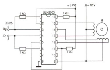 Neste caso, a corrente máxima que o circuito integrado ULN2003 pode fornecer é de 500 mA por enrolamento. Veja que aqui temos uma fonte de alimentação dupla que deve ter 5 V para a lógica interna e 12 V para a alimentação do motor. É importante observar que o terra do Cl no pino 8 deve ser comum ao PC ou circuito de acionamento digital, e também aos circuitos de 12 V e 5 V.