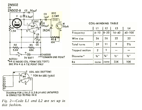 Este circuito de 1 transistor saiu numa Radio Electronics de fevereiro de 1962. As bobinas para as diversas faixas de frequência são encaixadas num soquete.