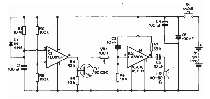Este circuito com base no LM380 foi encontrado em documentação dos anos 80. Os componentes são atuais e o transistor pode ser um equivalente de uso geral. Observe o uso de alto-falante de média impedância.