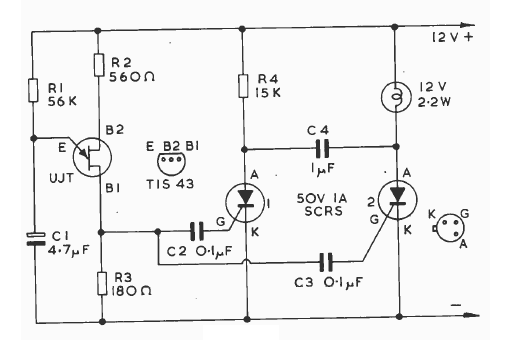 Este biestável alternada tem uma configuração explorada em outros artigos deste site. A frequência é dada basicamente por C1 e o unijunção pode ser o 2N2646 também.