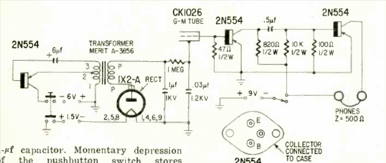 Este circuito foi publicado na revista Radio Electronics de junho de 1959. O circuito usa um inversor com transformador para gerar a alta tensão da válvula Geiger.