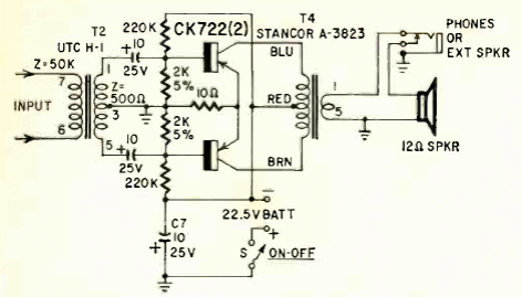 Esta etapa de potência com fração de watt foi publicada na Radio Electronics de setembro de 1950. Os transformadores eram tipos especiais da época. Havia uma saída para fone.