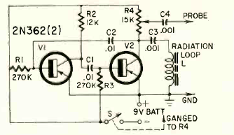 Este simples circuito de injetor de sinais foi encontrado na revista Radio Electronics de junho de 1961. Ele consiste num oscilador com dois transistores gerando um sinal rico em harmônicas.