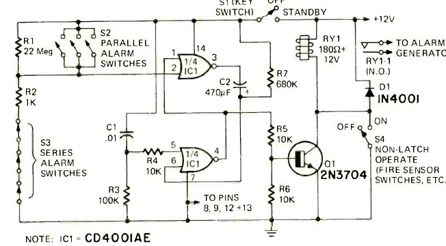 Este alarme com desligamento automático foi encontrado na revista Radio Electronics de abril de 1975. O tempo de acionamento é dado por C1 e R3. O alarme usa sensores em séries e em paralelo.