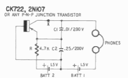 Este oscilador aproveita a indutância do fone de 2000 ohms como bobina do circuito oscilador. O transistor é de germânio. O circuito é de documentação dos anos 50.