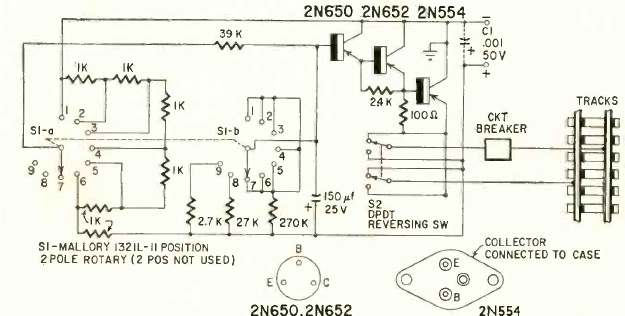 Este circuito para modelismo foi encontrado na revista Radio Electronics de fevereiro de 1960. O transistor de potência deve ser dotado de radiador de calor. O controle é feito por chave seletora.
