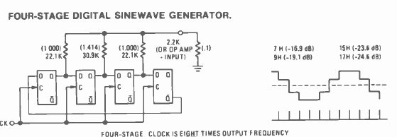 Na figura temos o modo de se gerar um sinal senoidal usando 4 flip-flops. O circuito é de uma revista Radio Electronics de novembro de 1976. A frequencia do clock fica dividida por 8.
