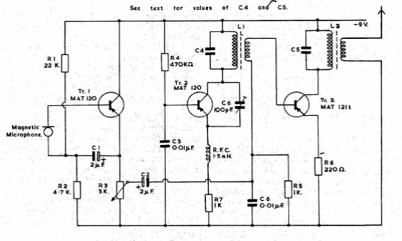Este pequeno transmissor de 3 transistores foi encontrado numa publicação inglesa de 1963. As bobinas devem ser de acordo com a frequência dos sinais transmitidos.