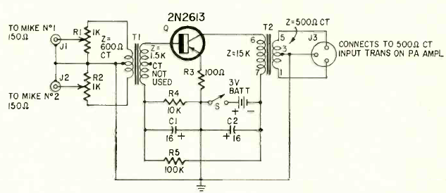 Encontramos este circuito numa Radio Electronics de fevereiro de 1966. O transistor é da época e os transformadores também. O circuito é alimentado por bateria. Observe as impedâncias.