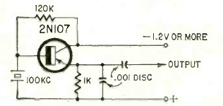 Usando o conhecido 2N107, um dos primeiros transistores comerciais, este circuito produz um sinal de 100 kHz de acordo com o cristal. A alimentação pode ser feita com tensões a partir de 1,2 V. Transistores equivalentes podem ser utilizados.
