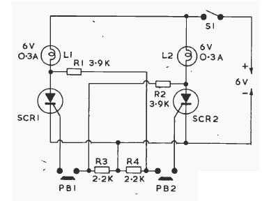 Usando SCRs comuns como o TIC106, este circuito tem como carga lâmpadas incandescentes, mas pode ser alterado para usar LEDs ou circuitos de aviso sonoro.