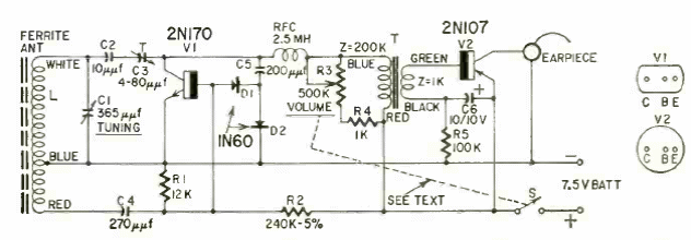 Este é um dos primeiros receptores transistorizados (2N107) publicados tendo saído na revista Radio Electronics de setembro de 1950. O circuito usa fone miniatura magnético de alta impedância e sintoniza a faixa de ondas médias.