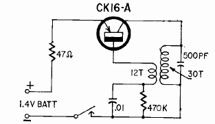 Este circuito com oscilador de bloqueio foi encontrado numa Radio Electronics de novembro de 1963. A frequência depende da bobina e qualquer transistor de uso geral pode ser utilizado. A potência é muito baixa.