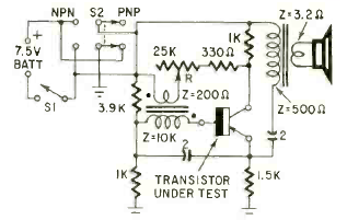 Este simples teste de ganho de transistores funciona como um oscilador para o transistor em teste. O circuito é de uma revista Radio Electronics de agosto de 1960. O ganho é dado por um potenciômetro calibrado indicado no ponto em que se obtém a oscilação.