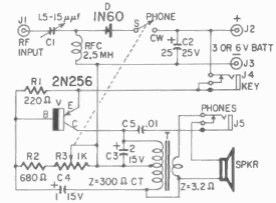 Este oscilador Hartley para telegrafia opera com o sinal do transmissor gerando um tom num alto-falante. O transistor é de germânio da época em que o circuito foi publicado.