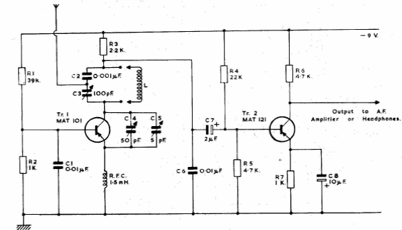A bobina L deste receptor determina a faixa de ondas recebida. O circuito é de uma publicação de 1963. Os transistores são de germânio.