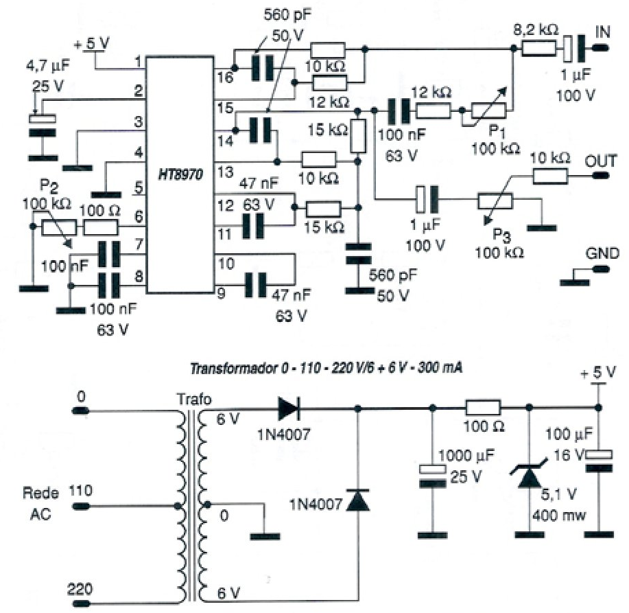 O potenciômetro P1 é responsável pelo tempo de repetição do som, podendo chegar a 600 ms. Finalmente, o potenciômetro P3 ajusta o nível de sinal de saída. Junto com diagrama do eco é dada a fonte de alimentação.