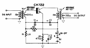 Encontrado numa publicação americana dos anos 50, este circuito usa no acoplamento de entrada e saída transformadores. O transistor é o CK722.