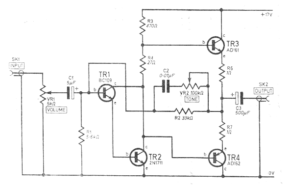 O circuito que apresentamos foi encontrado numa revista inglesa de 1973. O par complementar de transistores de potência AD161 e AD162 era muito popular na época possibilitando a construção de bons amplificadores até uns 5 ou 6 W. Se o leitor encontrar na sucata estes transistores pode usá-lo no circuito apresentado, trocando TR1 por um BC548 e TR2 por um 2N2222 ou BD135. A fonte é de 12 V a 15 V com pelo menos 1 A.