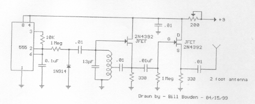 Este sinalizador, dependendo transistor pode ter alcance de algumas centenas de metros. O tom de áudio de 600 Hz é dada pelo666, A alimentação [e feita com bateria de 9 V. A bobina consta de 2 + 2 espiras de fio 2 ou 28 em forma de 1 cm.