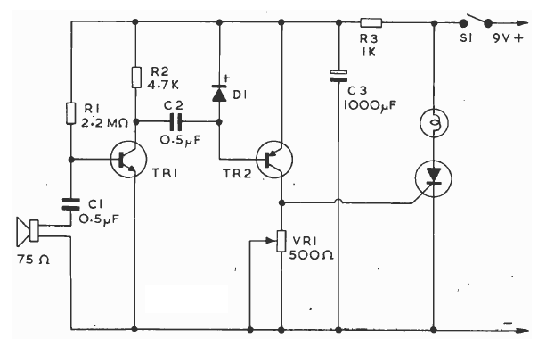 Esta chave sônica ou vox usa SCR comum e os transistores podem ser BC548 ou equivalentes. O microfone é um pequeno alto-falante de média impedância.